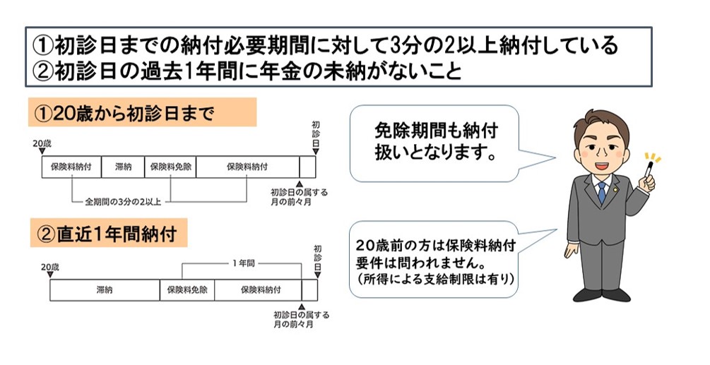 また、上記の要件にあてはまらなくても令和8年3月31日以前に初診日がある場合は、初診日の前日に、その前々月までの1年間に違法な滞納がなければ障害年金を受給できます。また、国民年金に加入する20歳になるまでに病気や怪我をして障害になった場合、保険料納付要件は問われず、障害年金を受け取ることができます。