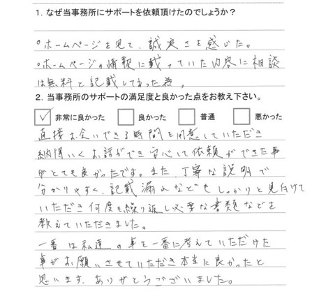 直接お会いできる時間を用意していただき、納得のいくお話ができ安心して依頼が出来た事がとても良かったです。