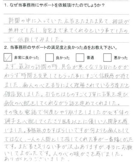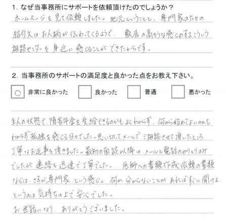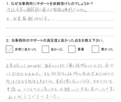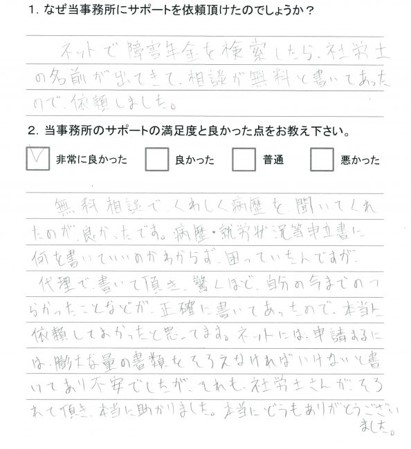 病歴・就労状況等申立書に何を書いていいのか分からず、困っていたんですが、代理で書いて頂き、驚くほど自分の今までの辛かったことなどが正確に書いてあったので、本当に依頼して良かったと思ってます。
