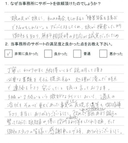 娘の夫が娘に、私の場合もしかすると「障害年金を請求できるかもしれない」とアドバイスをしてくれ、娘が検索した所、御社を知り無料相談時の対応が誠実だったため