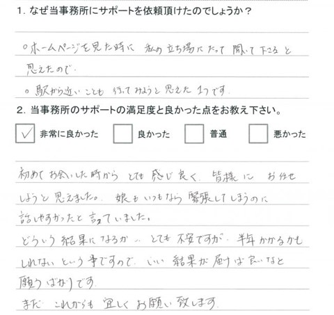 ・職場の近くに相談センターがあり、このように相談できる所があることを知りました。ネットで検索して気軽に相談できそうだったので、電話の上依頼しました。