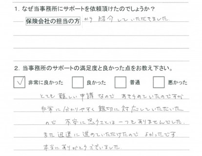 とても難しい申請なのであきらめていたのですが、非常に分かりやすく親切に対応していただいたので不安に思うことは一つもありませんでした。